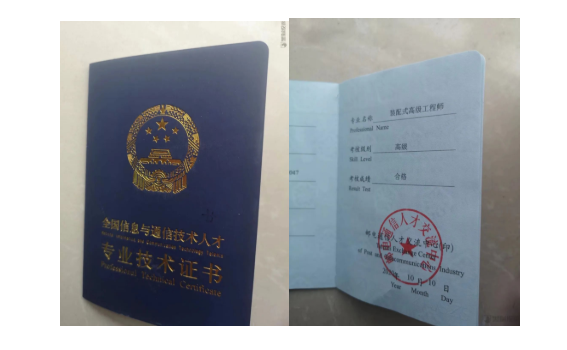 兩個月后,王芯拿到了證書,在她展示的照片上,深藍(lán)色證書封面上,印有國徽圖案,下面寫著“全國信息與通信技術(shù)人才專業(yè)技術(shù)證書”字樣,證書內(nèi)考核級別為“高級”,證書印發(fā)機(jī)構(gòu)為“郵電通信人才交流中心”。