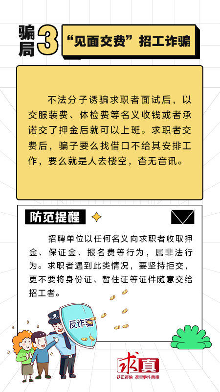 “網(wǎng)絡(luò)刷單兼職”“見面交費”“先培訓(xùn)后就業(yè)”……找工作的時候,你有沒有遇到過呢?又到畢業(yè)季,不少學(xué)生從校園走向社會。此時騙子們也蠢蠢欲動,打著“招工”等名義實施詐騙。以下6種常見的招聘騙局,提醒大家注意防范。