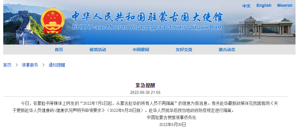 據(jù)中國駐蒙古國使館官網(wǎng)消息,6月30日,在蒙臉書等媒體上轉(zhuǎn)發(fā)的“2022年7月1日起,從蒙古赴華的所有人員不再隔離”的信息為假消息。