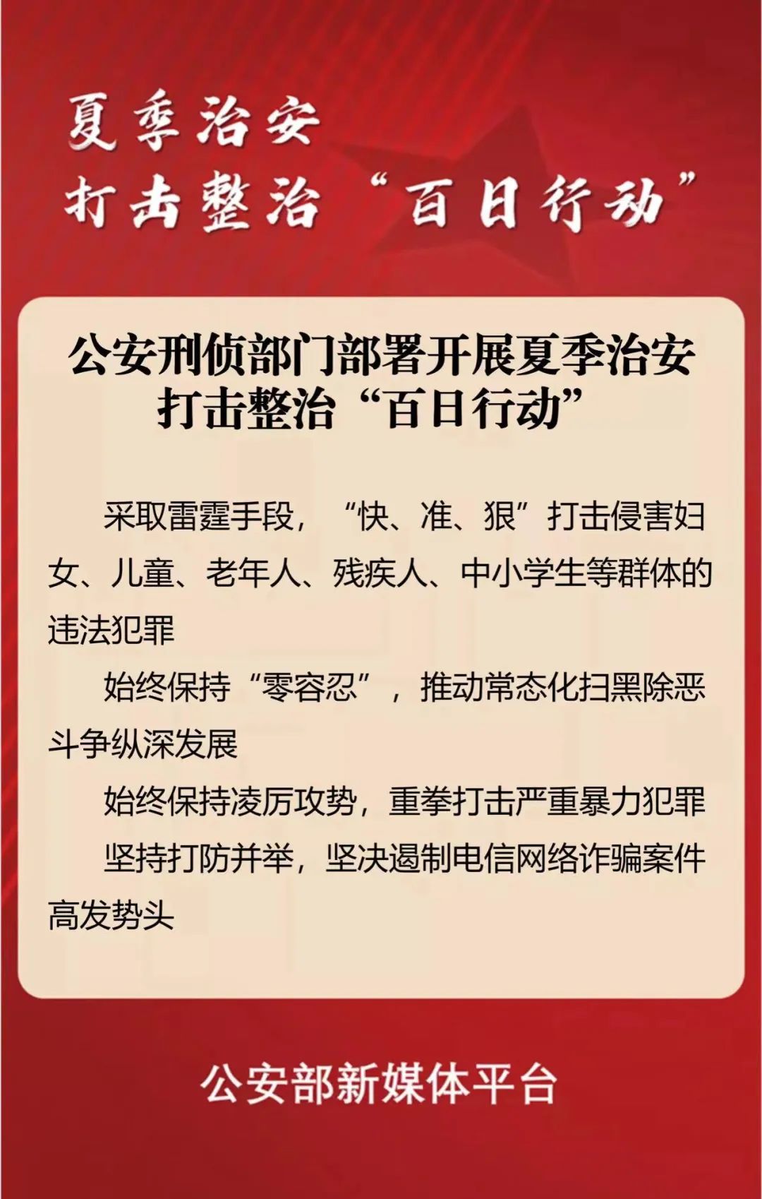 記者從公安部了解到,全國(guó)公安刑偵部門夏季治安打擊整治“百日行動(dòng)”電視電話會(huì)議日前召開(kāi),部署公安刑偵部門認(rèn)真貫徹公安部黨委決策部署,強(qiáng)化責(zé)任擔(dān)當(dāng)、問(wèn)題導(dǎo)向和目標(biāo)引領(lǐng),迅速投入“百日行動(dòng)”,重拳打擊各類突出違法犯罪活動(dòng),有效凈化社會(huì)治安環(huán)境,堅(jiān)決維護(hù)社會(huì)大局穩(wěn)定。