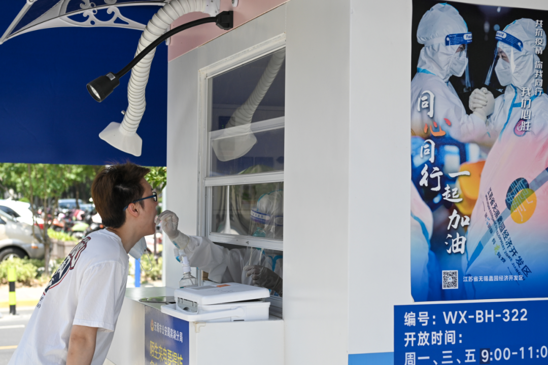 7月5日,在無錫市濱湖區(qū)蠡園街道的一處核酸采樣點(diǎn),一名市民在進(jìn)行核酸采樣。新華社記者 李博 攝