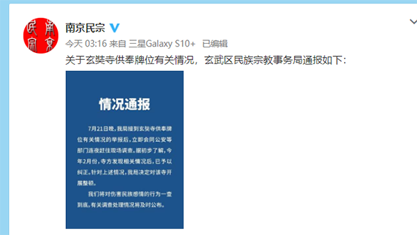 7月21日晚,我局接到玄奘寺供奉牌位有關情況的舉報后,立即會同公安等部門連夜趕往現(xiàn)場調(diào)查。據(jù)初步了解,今年2月份,寺方發(fā)現(xiàn)相關情況后,已予以糾正。針對上述情況,我局決定對該寺開展整頓。我們將對傷害民族感情的行為一查到底,有關調(diào)查處理情況將及時公布。