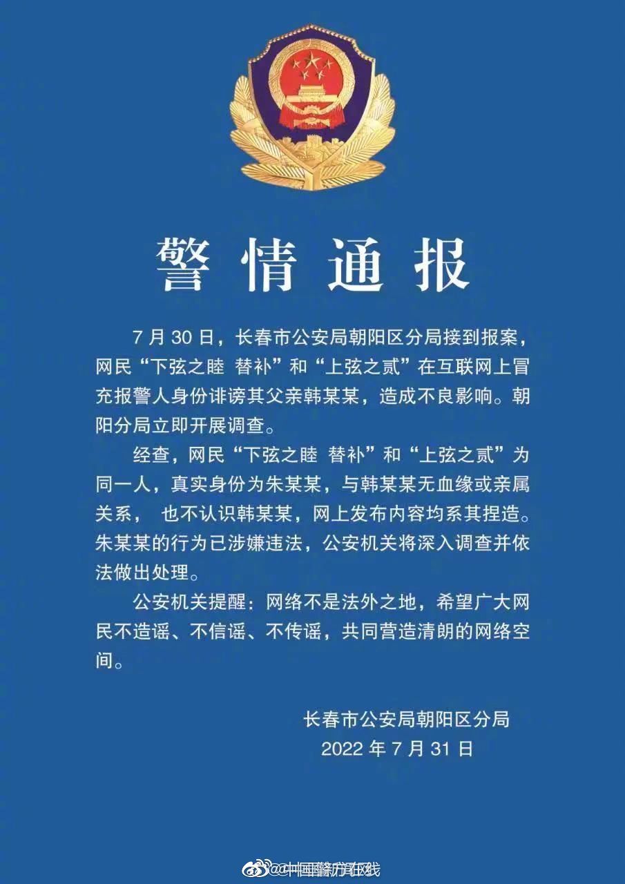 經(jīng)查,網(wǎng)民“下弦之睦 替補”和“上弦之貳”為同一人,真實身份為朱某某,與韓某某無血緣或親屬關(guān)系,也不認識韓某某,網(wǎng)上發(fā)布內(nèi)容均系其捏造。朱某某的行為已涉嫌違法,公安機關(guān)將深入調(diào)查并依法做出處理。