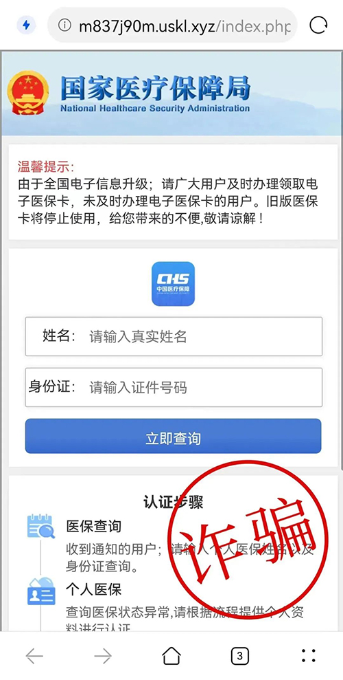 近日,有不法分子冒用醫(yī)保局名義,通過(guò)發(fā)送短信或電話實(shí)施詐騙,“您的醫(yī)保資料缺失,將被暫停使用”“您的醫(yī)用保險(xiǎn)未升級(jí)電子版暫時(shí)無(wú)法報(bào)銷(xiāo)”,誘導(dǎo)市民點(diǎn)擊釣魚(yú)網(wǎng)址鏈接,更新完善資料,進(jìn)行銀行卡賬戶盜刷。