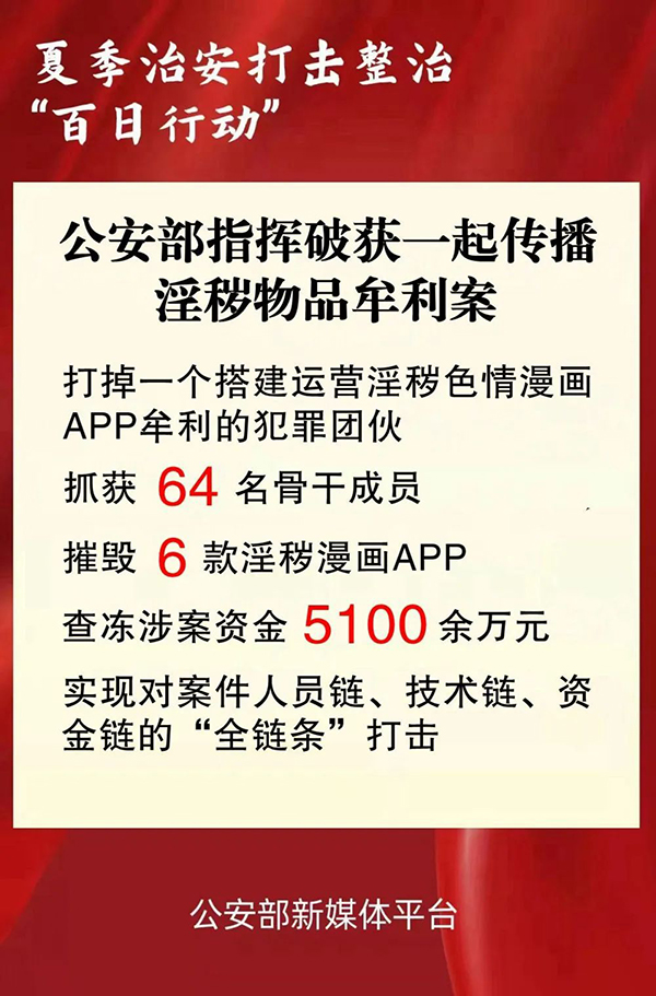 記者11日從公安部獲悉,日前,在公安部治安管理局指揮部署下,15個(gè)省區(qū)市公安機(jī)關(guān)開展集中收網(wǎng),成功破獲一起傳播淫穢物品牟利案,打掉一個(gè)搭建運(yùn)營(yíng)淫穢色情漫畫App牟利的犯罪團(tuán)伙,抓獲64名骨干成員,摧毀6款淫穢漫畫App,查凍涉案資金5100余萬元,實(shí)現(xiàn)對(duì)案件人員鏈、技術(shù)鏈、資金鏈的“全鏈條”打擊。