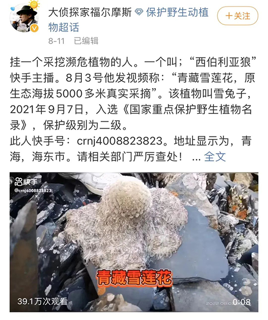 8月11日,一網(wǎng)友發(fā)文爆料稱,網(wǎng)名為“西伯利亞狼”的主播發(fā)布了一則自己在青海采摘“青藏雪蓮花”的視頻。