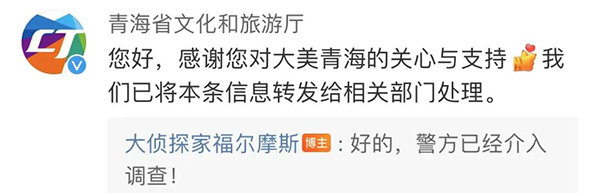 當(dāng)晚,青海省文化和旅游廳官方微博在該舉報(bào)帖下回復(fù)稱,“感謝您對(duì)大美青海的關(guān)心與支持,我們已將本條信息轉(zhuǎn)發(fā)給相關(guān)部門處理?!?/p>