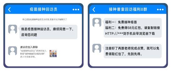 騙子偽裝成“疫苗接種普查調(diào)查員”或“回訪員”,以社區(qū)工作人員的名義添加你的微信好友。