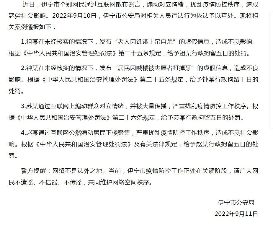 據(jù)“平安伊犁”微信公眾號9月11日消息,近日,伊寧市個別網(wǎng)民通過互聯(lián)網(wǎng)散布謠言,煽動對立情緒,擾亂疫情防控秩序,造成惡劣社會影響。2022年9月10日,伊寧市公安局對相關(guān)人員違法行為依法予以查處?,F(xiàn)將相關(guān)案例通報如下:
