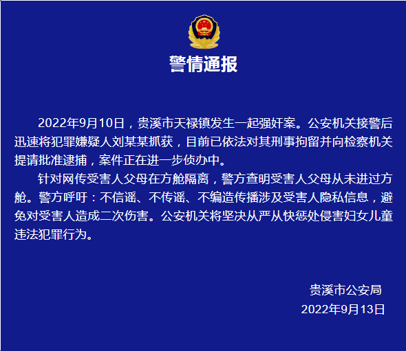 9月13日,江西省貴溪市公安局發(fā)布通報:2022年9月10日,貴溪市天祿鎮(zhèn)發(fā)生一起強奸案。公安機關接警后迅速將犯罪嫌疑人劉某某抓獲,目前已依法對其刑事拘留并向檢察機關提請批準逮捕,案件正在進一步偵辦中。