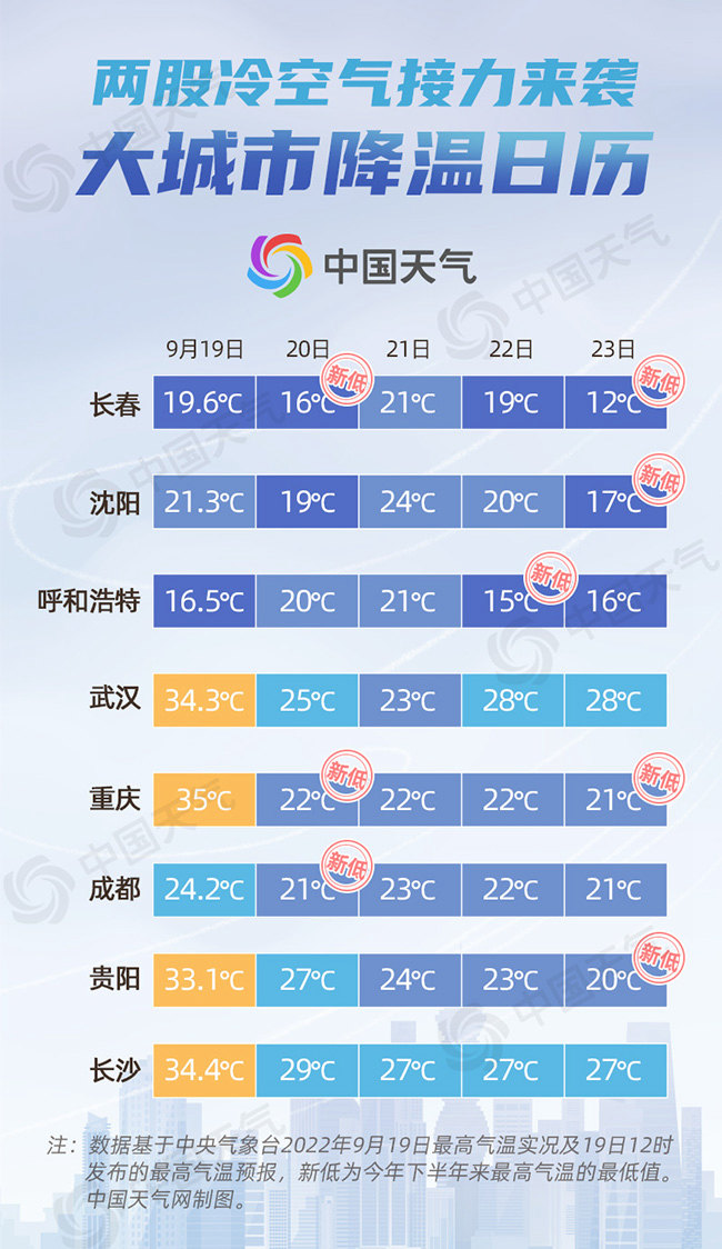 未來(lái)三天,冷空氣繼續(xù)南下,降溫也將自北向南推進(jìn)。據(jù)中國(guó)天氣網(wǎng)氣象分析師張娟介紹,北方降溫大多集中在今明兩天,今天寧夏北部、陜西北部、山西中北部、內(nèi)蒙古中部等地已經(jīng)出現(xiàn)超過(guò)10℃的降溫,部分地區(qū)超過(guò)15℃。降溫后,華北、黃淮今明兩天最高氣溫會(huì)降到25℃上下,東北、西北多地最高氣溫20℃上下,甚至更低。除了最高氣溫,最低氣溫也將下降,明天清晨哈爾濱、沈陽(yáng)、長(zhǎng)春等地最低氣溫僅有4℃左右,北京最低氣溫也僅有13℃,將紛紛創(chuàng)下今年下半年來(lái)氣溫新低。