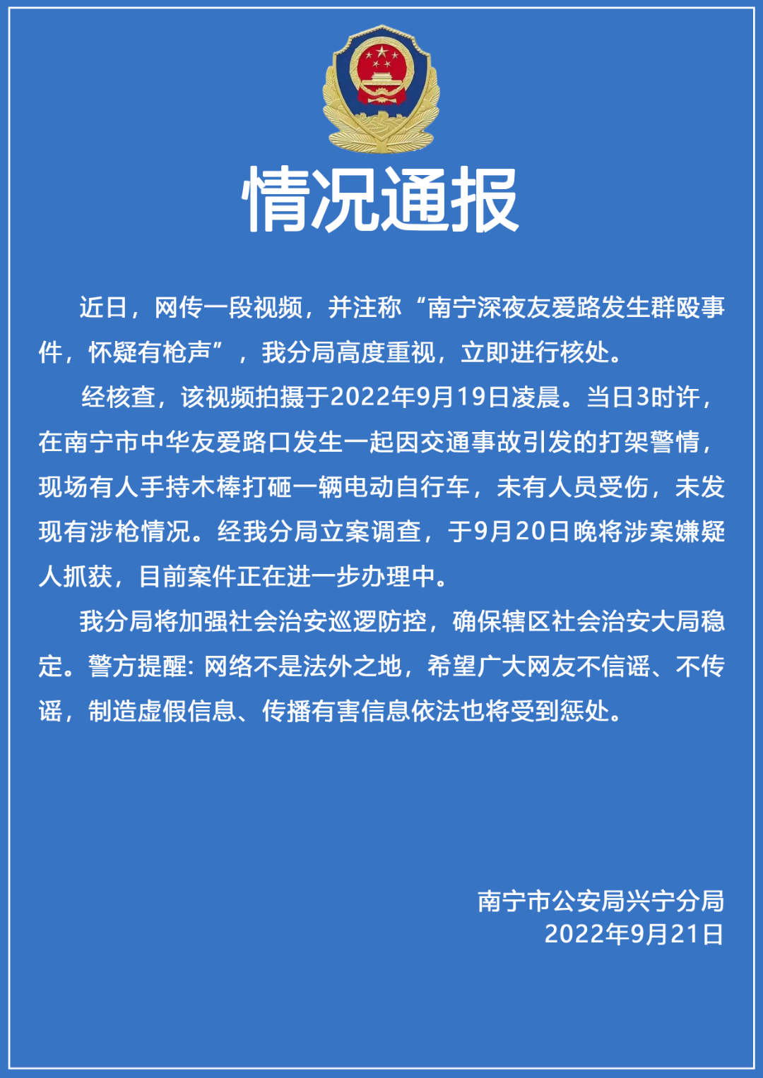 經核查,該視頻拍攝于2022年9月19日凌晨。當日3時許,在南寧市中華友愛路口發(fā)生一起因交通事故引發(fā)的打架警情,現(xiàn)場有人手持木棒打砸一輛電動自行車,未有人員受傷,未發(fā)現(xiàn)有涉槍情況。經我分局立案調查,于9月20日晚將涉案嫌疑人抓獲,目前案件正在進一步辦理中。