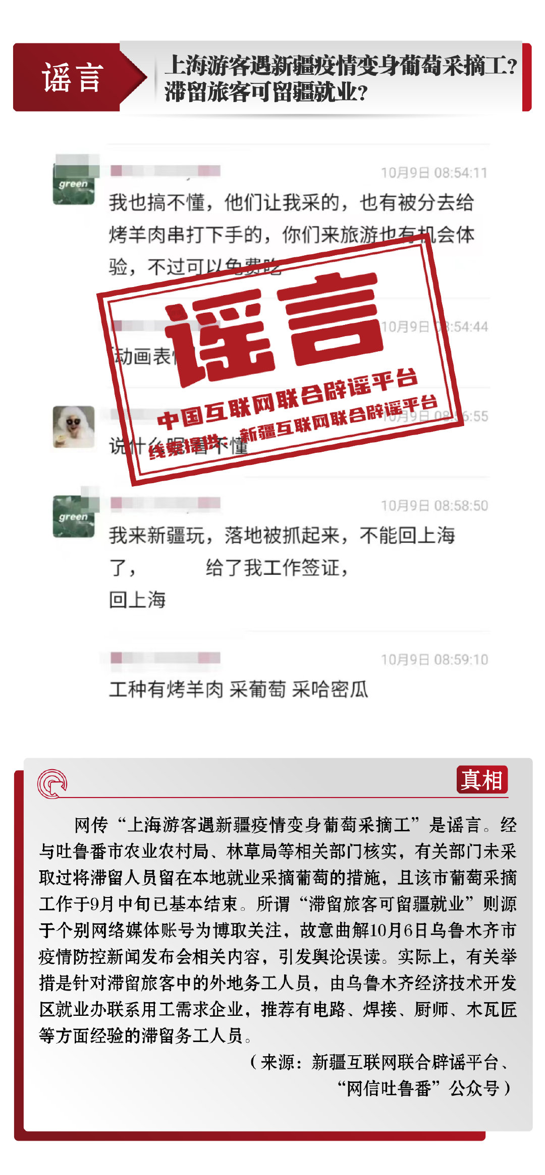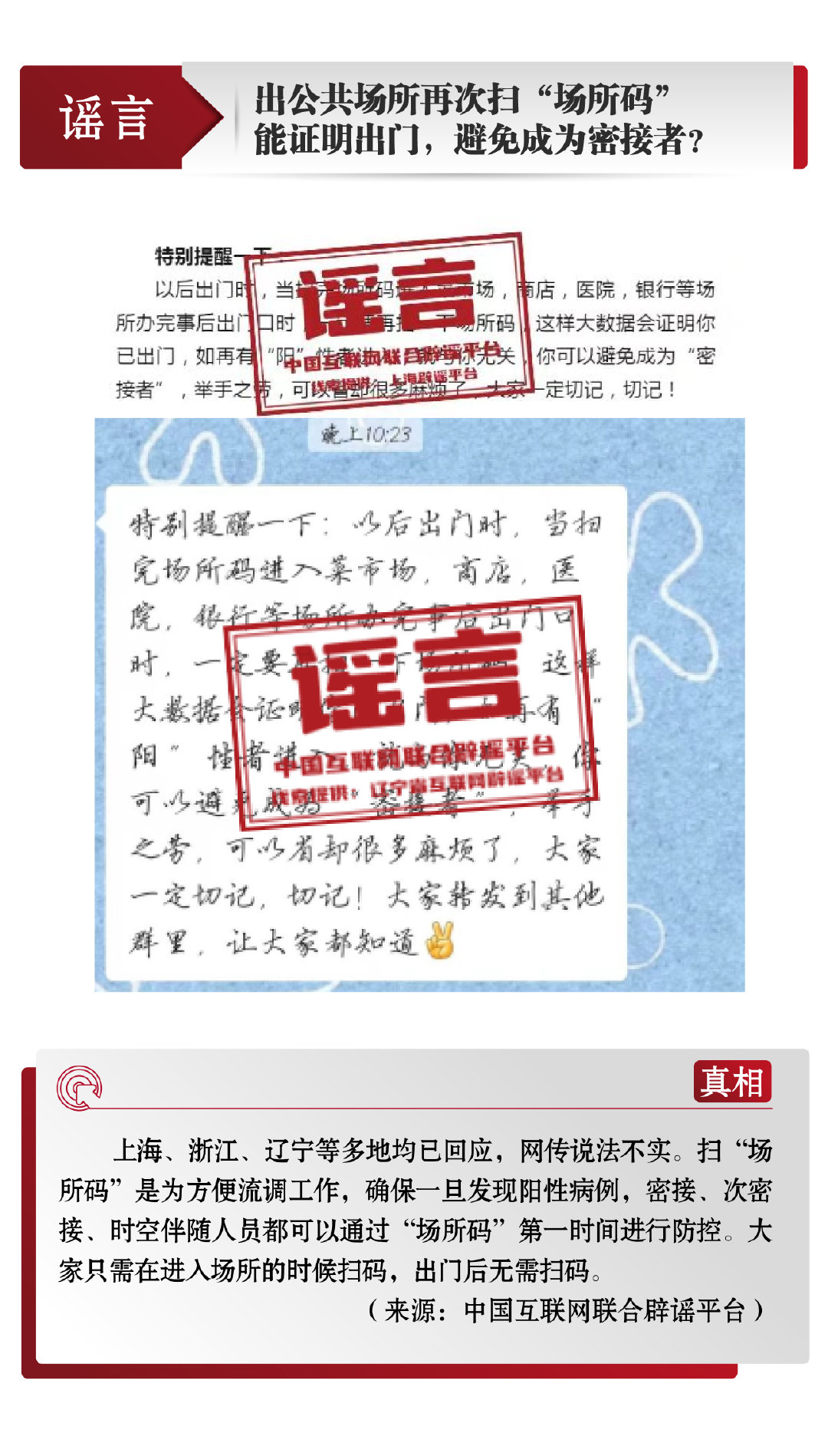 混淆視聽,涉疫流言干擾防疫大局。國(guó)慶長(zhǎng)假期間,人員流動(dòng)性和聚集性增加,網(wǎng)上涉及防疫措施、核酸檢測(cè)、物資保供等方面的謠言也時(shí)有出現(xiàn)。諸如“上海游客遇新疆疫情變身葡萄采摘工,120元1天包吃包住月底回家”等虛假信息純屬斷章取義、擾亂視聽。傳言“出入掃兩次碼,可避免成密接”這一“好心提醒”在多地傳播,而實(shí)際情況卻并非如此。出門時(shí)再次掃描“場(chǎng)所碼”并沒有“證明出門”的作用,對(duì)于是否作為密接人員的判定,還是需要根據(jù)疾控等相關(guān)部門的流調(diào)來確認(rèn)。此外,網(wǎng)傳鄭州、西安、福州等城市“全市靜默”“某月某日封城”等謠言反復(fù)出現(xiàn),對(duì)當(dāng)?shù)匾咔榉揽毓ぷ髟斐刹涣加绊?;“男子確診陽(yáng)性被吊車吊起轉(zhuǎn)移”“健康碼藍(lán)碼可3個(gè)月免做核酸”也純屬臆測(cè),嚴(yán)重誤導(dǎo)公眾。