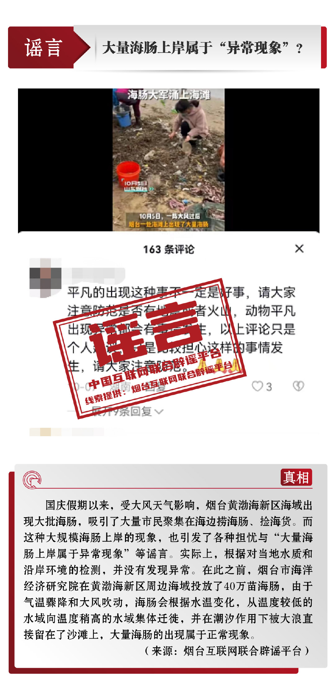聳人聽聞,所謂“獨(dú)家爆料”渲染焦慮心理。10月初,煙臺(tái)黃渤海新區(qū)海域大量海腸上岸“蔚為奇觀”,別有用心者為博取眼球,編造“大量海腸上岸是異?,F(xiàn)象”等流言。實(shí)際上,正是因?yàn)楹Q笊鷳B(tài)環(huán)境持續(xù)向好,為海腸提供了良好的生長(zhǎng)環(huán)境,海腸產(chǎn)量高,加上降溫和大風(fēng)天氣,才出現(xiàn)海腸上岸這一現(xiàn)象,民眾無需擔(dān)憂。而所謂“長(zhǎng)期戴口罩會(huì)得肺結(jié)節(jié)”“做核酸前喝飲料會(huì)假陽(yáng)性”更是純屬子虛烏有。造謠傳謠者以所謂“獨(dú)家爆料”制造聳動(dòng)、嘩眾取寵,使部分受眾不知不覺就中了謠言的圈套。