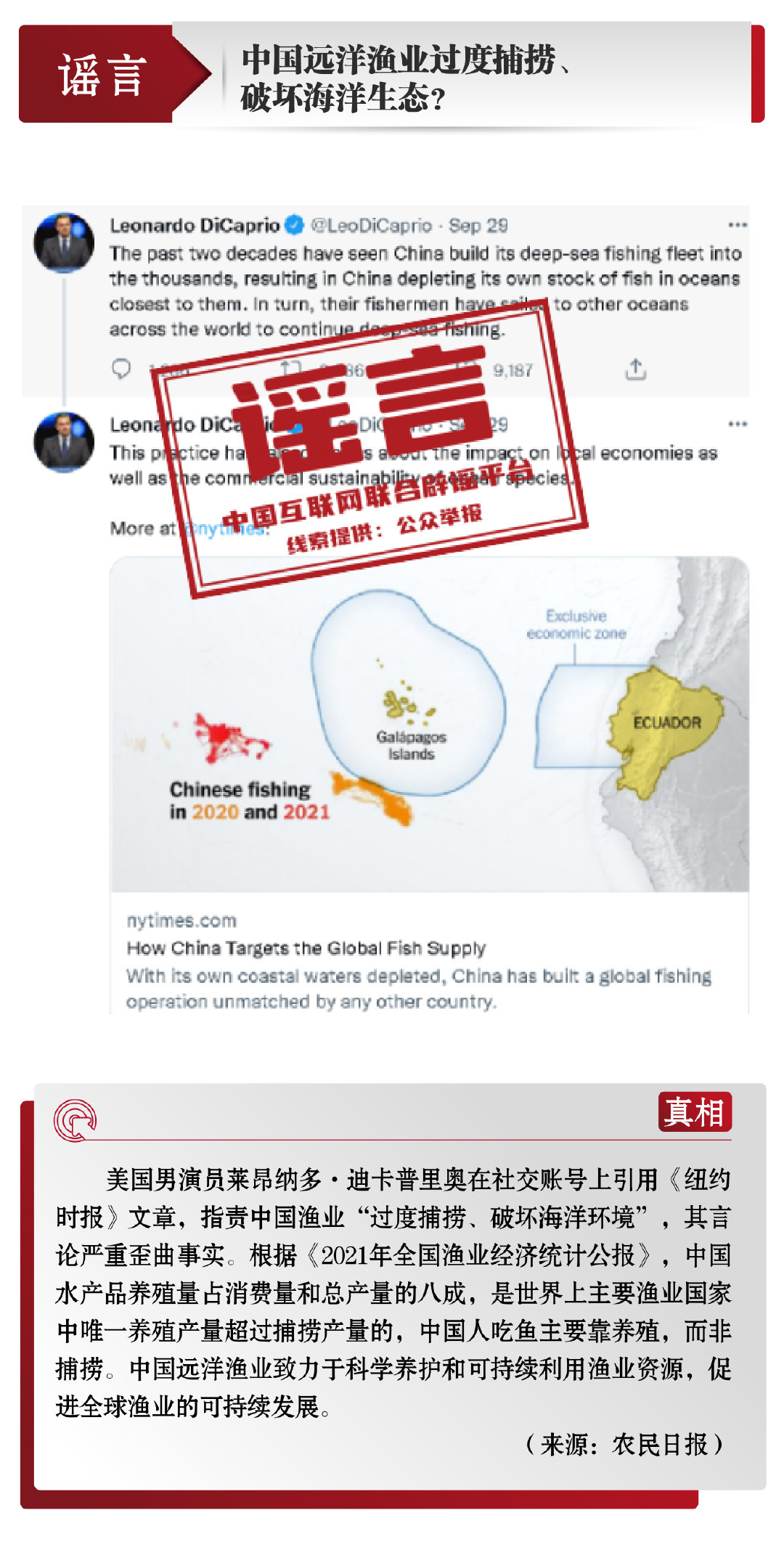 罔顧事實(shí),借“環(huán)保”名義亂作文章。一些美西方媒體和個(gè)人對(duì)中國(guó)抱持固有偏見,甚至故意“污名化”。近期,一好萊塢知名男演員在社交賬號(hào)上轉(zhuǎn)引《紐約時(shí)報(bào)》錯(cuò)誤報(bào)道,指責(zé)中國(guó)漁業(yè)“過度捕撈、破壞海洋環(huán)境”,完全無視中國(guó)堅(jiān)持綠色可持續(xù)發(fā)展的事實(shí)與貢獻(xiàn)。實(shí)際上,根據(jù)《2021年全國(guó)漁業(yè)經(jīng)濟(jì)統(tǒng)計(jì)公報(bào)》,2021年,我國(guó)海水和淡水養(yǎng)殖量占水產(chǎn)品總產(chǎn)量的80%,占世界水產(chǎn)品養(yǎng)殖總產(chǎn)量的60%左右。中國(guó)水產(chǎn)品養(yǎng)殖量占消費(fèi)量和總產(chǎn)量的八成,是世界上主要漁業(yè)國(guó)家中唯一養(yǎng)殖產(chǎn)量超過捕撈產(chǎn)量的。中國(guó)人吃魚,不是靠捕撈向大自然無限制地索取,而是靠自力更生搞養(yǎng)殖業(yè)。同時(shí),中國(guó)的整體海洋捕撈量正在以每年8%左右的速度減少,全球捕撈總量卻在以每年4%的數(shù)量增加,反觀歐美等發(fā)達(dá)國(guó)家,自養(yǎng)水產(chǎn)品產(chǎn)量很低,主要靠海洋捕撈和進(jìn)口,到底是誰管不住嘴,一目了然。