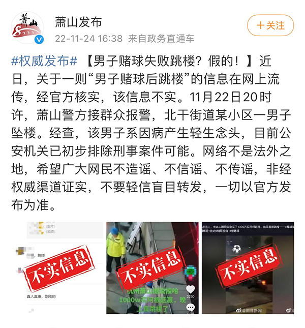 據(jù)浙江省杭州市蕭山區(qū)人民政府新聞辦公室官方微博消息,近日,關(guān)于一則“男子賭球后跳樓”的信息在網(wǎng)上流傳,經(jīng)官方核實,該信息不實。11月22日20時許,蕭山警方接群眾報警,北干街道某小區(qū)一男子墜樓。經(jīng)查,該男子系因病產(chǎn)生輕生念頭,目前公安機(jī)關(guān)已初步排除刑事案件可能。網(wǎng)絡(luò)不是法外之地,希望廣大網(wǎng)民不造謠、不信謠、不傳謠,非經(jīng)權(quán)威渠道證實,不要輕信盲目轉(zhuǎn)發(fā),一切以官方發(fā)布為準(zhǔn)。
