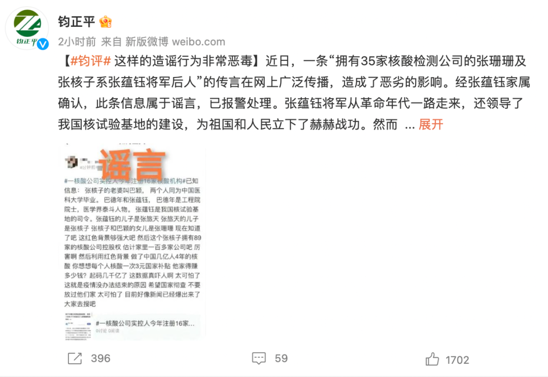 文章說:近日,一條“擁有35家核酸檢測公司的張珊珊及張核子系張?zhí)N鈺將軍后人”的傳言在網(wǎng)上廣泛傳播,造成了惡劣的影響。經(jīng)張?zhí)N鈺家屬確認(rèn),此條信息屬于謠言,已報(bào)警處理。