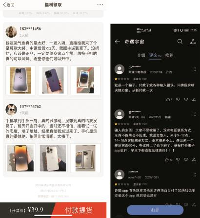 左側(cè)為盲盒抽獎頁面中“托”們的留言,右側(cè)為“奇遇宇宙”App中的真實評價。毛錦偉 攝