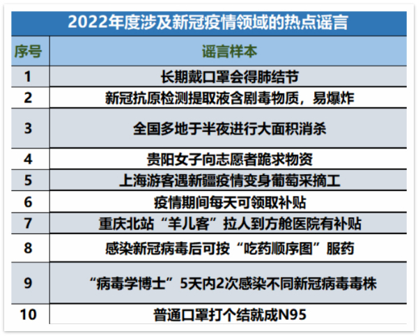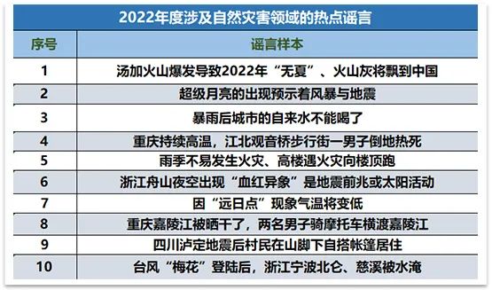 ??2022年,國(guó)際國(guó)內(nèi)熱點(diǎn)事件中,網(wǎng)絡(luò)謠言“趁虛而入”,時(shí)有發(fā)酵,涉及疫情防控、公共政策、社會(huì)事件、醫(yī)療健康、自然現(xiàn)象等公眾關(guān)心關(guān)切領(lǐng)域,可謂“套路百出”,令人深惡痛絕。針對(duì)網(wǎng)絡(luò)謠言這一痼疾,中國(guó)互聯(lián)網(wǎng)聯(lián)合辟謠平臺(tái)重拳出擊,全年共受理網(wǎng)民謠言舉報(bào)信息3萬余條,匯集謠言樣本和辟謠數(shù)據(jù)2.45萬條,共發(fā)布各類辟謠稿件1.31萬篇,推出了12期《打擊網(wǎng)絡(luò)謠言 共建清朗家園 中國(guó)互聯(lián)網(wǎng)聯(lián)合辟謠平臺(tái)月度辟謠榜》、科學(xué)流言榜以及“涉防災(zāi)減災(zāi)辟謠榜”“涉化妝品辟謠榜”“涉高考高招辟謠榜”“涉食品安全辟謠榜”等行業(yè)辟謠榜單。這些謠言背后的真相您都了解了嗎?中國(guó)互聯(lián)網(wǎng)聯(lián)合辟謠平臺(tái)特此盤點(diǎn)解析,為您澄清謬誤,傳遞事實(shí)真相。