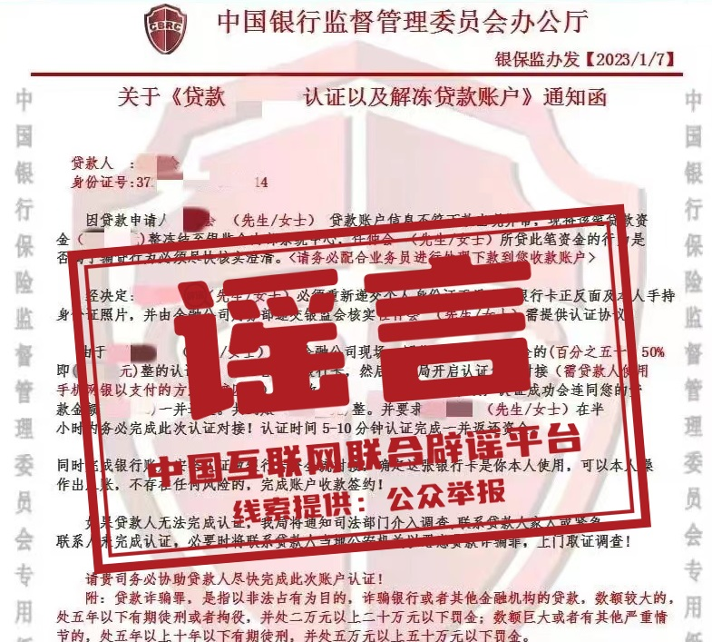 ??真相:近日,有多名網(wǎng)友反映收到來自“中國(guó)銀行監(jiān)督管理委員會(huì)辦公廳”發(fā)出的“通知函”,稱“因貸款申請(qǐng)人XX貸款賬戶信息不符,下款出現(xiàn)異常,現(xiàn)將貸款資金凍結(jié)……需要重新遞交身份證正反面,同時(shí)需提交貸款金融50%的對(duì)接認(rèn)證金,才能解凍賬戶”。