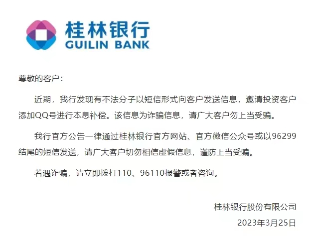 廣大用戶如需了解桂林銀行官方公告,請(qǐng)通過(guò)桂林銀行官方網(wǎng)站、官方微信公眾號(hào)或以96299結(jié)尾的短信,切勿相信虛假信息,謹(jǐn)防上當(dāng)受騙。