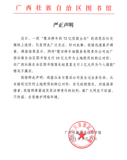 廣西壯族自治區(qū)圖書館對此高度重視,及時展開調查。調查結果顯示,網(wǎng)傳“慧泊停車場服務有限責任公司向廣西壯族自治區(qū)圖書館支付10億元作為土地使用權轉讓對價、向廣西壯族自治區(qū)圖書館館長趙某某支付1億元作為個人借款”情況與事實不符。