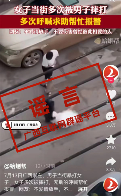 7月13日,某短視頻平臺出現(xiàn)一段視頻配文稱“7月13日廣西崇左,男子當(dāng)街暴打女子,女子多次被摔打,無助的呼喊幫忙報警”,視頻內(nèi)容顯示一名男子當(dāng)街腳踹毆打女子,女子呼喊“幫我報警謝謝”。