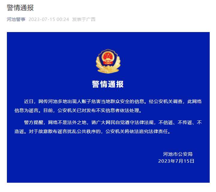 7月15日,河池市公安局發(fā)布警情通報(bào),對(duì)相關(guān)信息進(jìn)行了辟謠。