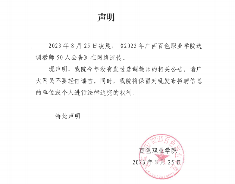 對(duì)此百色職業(yè)學(xué)院發(fā)布聲明表示,百色職業(yè)學(xué)院今年沒有發(fā)過選調(diào)教師的相關(guān)公告。請(qǐng)廣大網(wǎng)民不要輕信謠言。