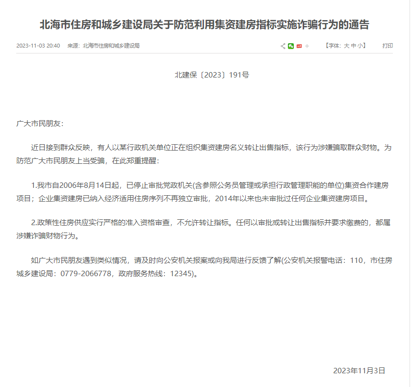11月3日北海市住房和城鄉(xiāng)建設(shè)局發(fā)布了一份通告,通告中說,近日接到群眾反映,有人以北海市某行政機關(guān)單位正在組織集資建房名義轉(zhuǎn)讓出售指標,該行為涉嫌騙取群眾財物。