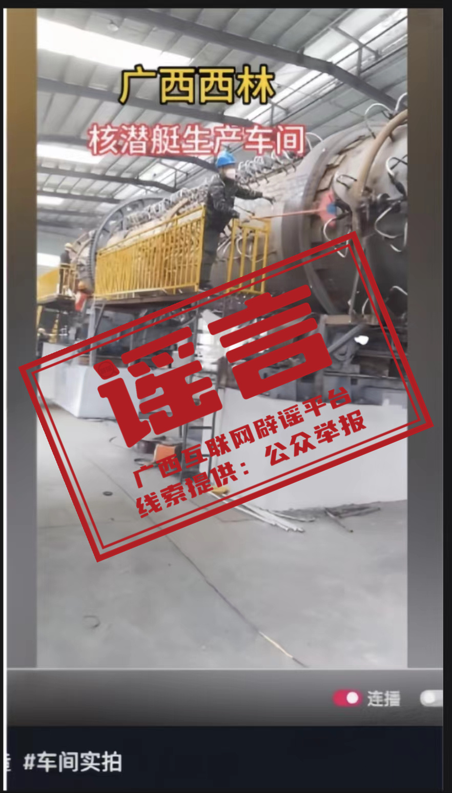 經(jīng)廣西互聯(lián)網(wǎng)辟謠平臺向相關(guān)部門核實,該視頻內(nèi)容為虛假謠言,百色西林縣不存在核潛艇生產(chǎn)車間,也未生產(chǎn)核彈頭。