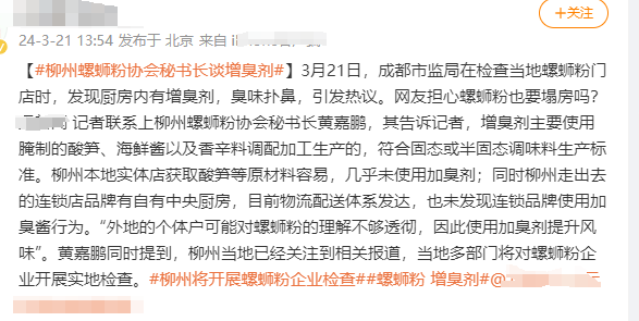 3月21日,柳州螺螄粉協(xié)會(huì)秘書長(zhǎng)黃嘉鵬針對(duì)“增臭劑“進(jìn)行了回應(yīng)。
