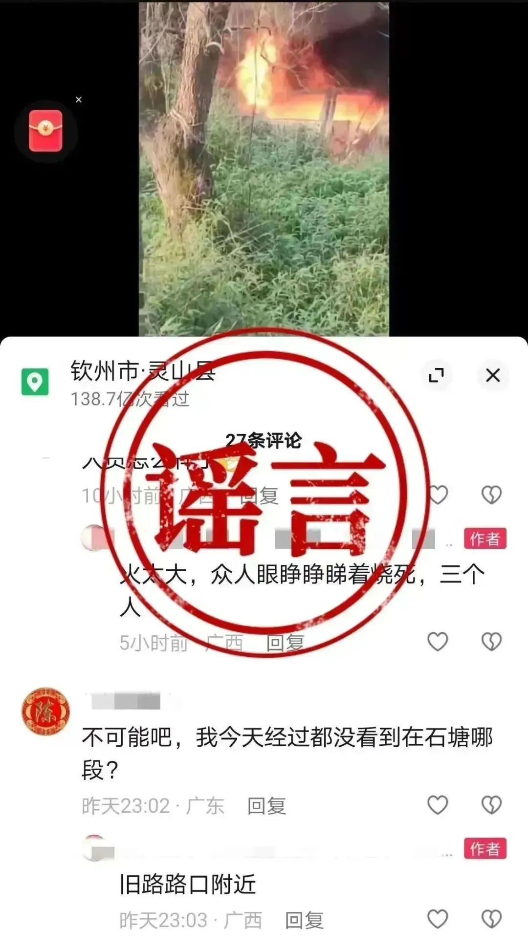 2月20日,有網(wǎng)民在網(wǎng)絡(luò)平臺(tái)發(fā)布交通事故視頻 ,并在視頻評(píng)論區(qū)稱“該事故共造成三人被當(dāng)場(chǎng)燒死”,引發(fā)網(wǎng)民關(guān)注。