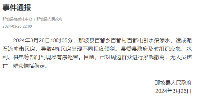 3月26日那坡縣人民政府發(fā)布事件通報(bào)表示:2024年3月26日18時(shí)05分,那坡縣百都鄉(xiāng)百都村百都屯引水渠滲水,造成泥石流沖擊民房,導(dǎo)致4棟民房出現(xiàn)不同程度傾斜??h委縣政府及時(shí)組織應(yīng)急、水利、供電等部門到現(xiàn)場(chǎng)有序處置。目前,已對(duì)周邊群眾進(jìn)行緊急撤離,無(wú)人員傷亡,群眾情緒穩(wěn)定。