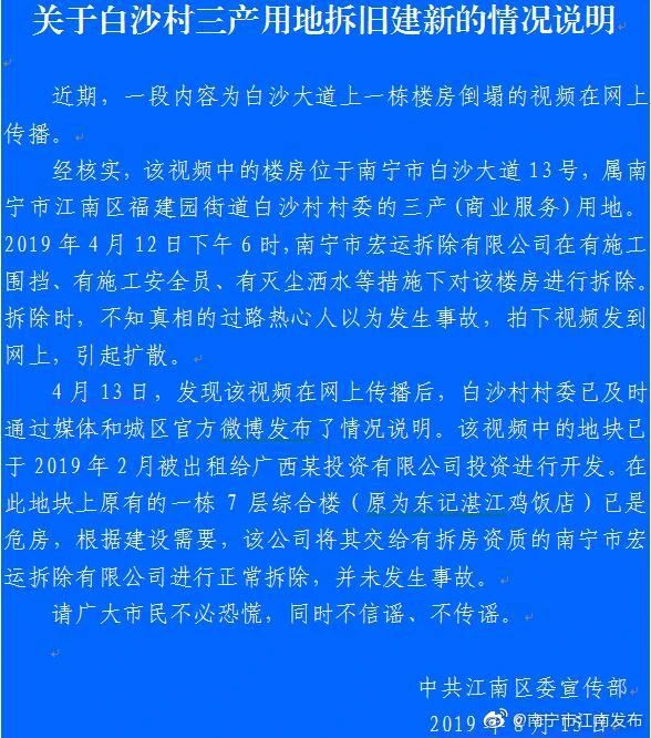 據(jù)悉,該視頻中的樓房位于南寧市白沙大道13號(hào),屬白沙村村委的三產(chǎn)(商業(yè)服務(wù))用地。2019年2月,該地塊被出租給廣西某投資有限公司投資進(jìn)行開發(fā),在此地塊上原有的一棟7層綜合樓(原為東記湛江雞飯店)已是危房,該公司交給有拆房資質(zhì)的南寧市宏運(yùn)拆除有限公司進(jìn)行拆除。