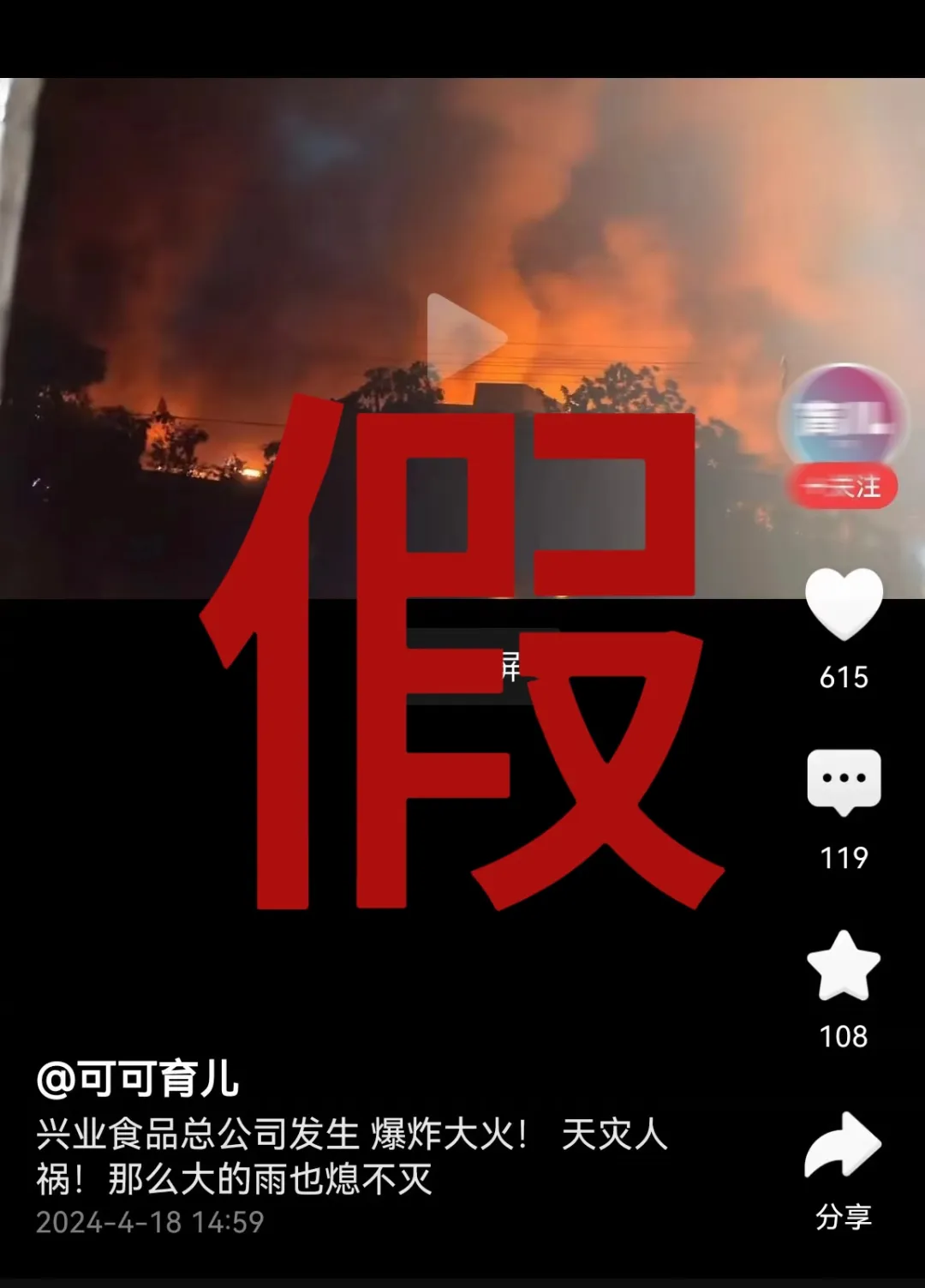 4月23日,興業(yè)警方工作中發(fā)現(xiàn),有人在多個(gè)視頻平臺(tái)發(fā)布視頻,將一起普通廠房起火事故轉(zhuǎn)嫁為某食品公司爆炸的重大事故,引發(fā)大量網(wǎng)民圍觀、熱議。