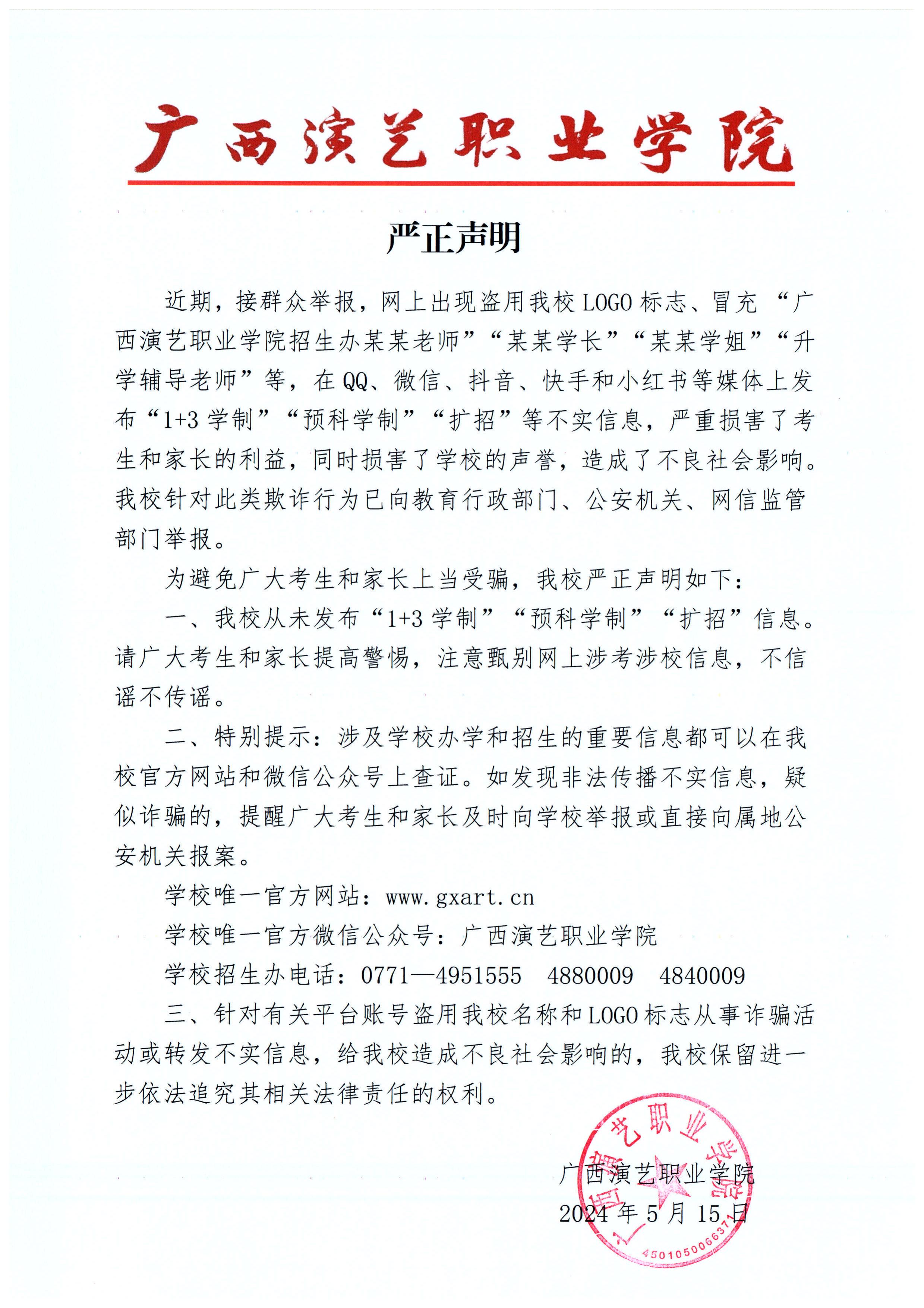 5月15日,廣西演藝職業(yè)學(xué)院發(fā)布嚴(yán)正聲明表示: