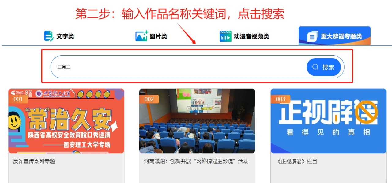 第二步:輸入作品名稱關(guān)鍵詞(如“三月三”),點擊搜索