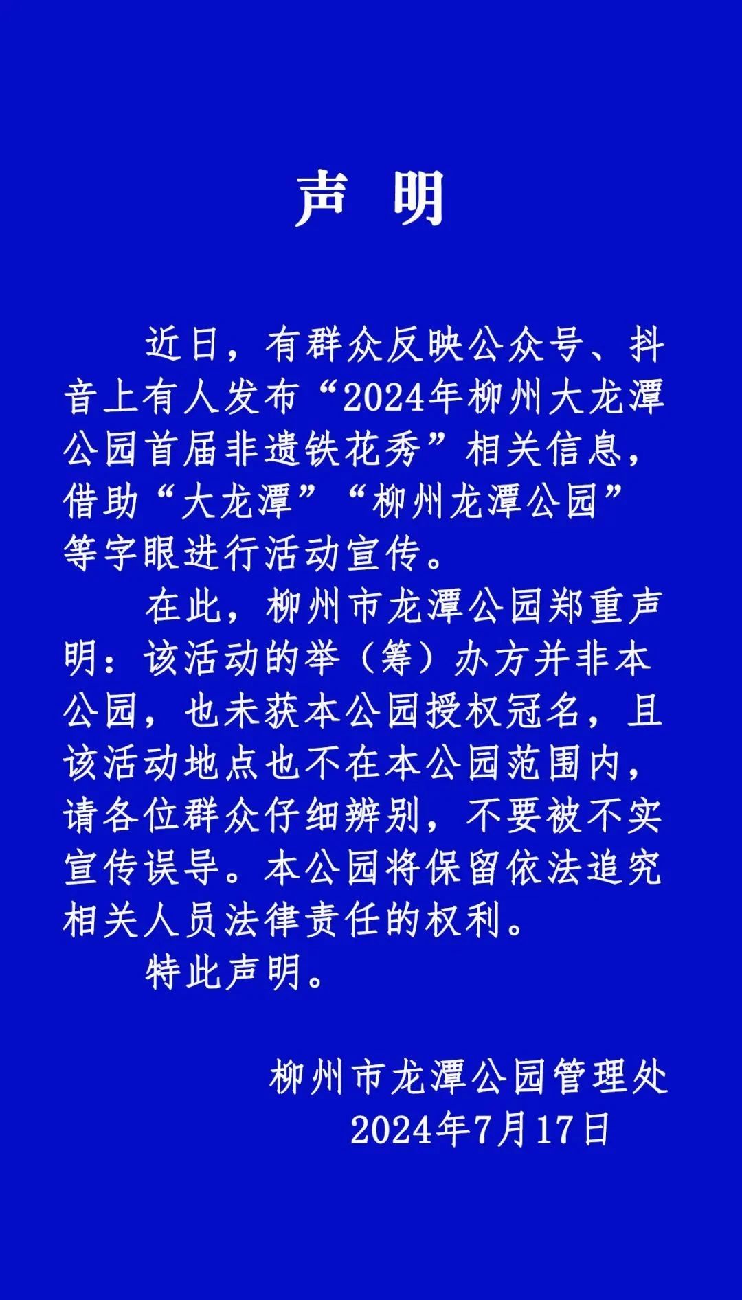 7月17日,柳州市龍?zhí)豆珗@官方微信號發(fā)布聲明,表示該活動的舉(籌)辦方并非本公園,也未獲本公園授權(quán)冠名,且該活動地點也不在本公園范圍內(nèi)。