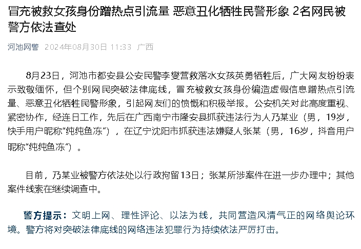 8月30日,“河池網(wǎng)警”官方公眾號(hào)發(fā)布消息,先后抓獲兩名涉嫌假冒被救女孩的惡意造謠者。根據(jù)通報(bào)稱,“純純魚(yú)凍”系個(gè)別網(wǎng)民突破法律底線,冒充被救女孩身份編造虛假信息蹭熱點(diǎn)引流量、惡意丑化犧牲民警形象。公安機(jī)關(guān)對(duì)此高度重視、緊密協(xié)作,經(jīng)連日工作,先后在廣西南寧市隆安縣抓獲違法行為人乃某業(yè)(男,19歲,快手用戶昵稱“純純魚(yú)凍”),在遼寧沈陽(yáng)市抓獲違法嫌疑人張某(男,16歲,抖音用戶昵稱“純純魚(yú)凍”)。