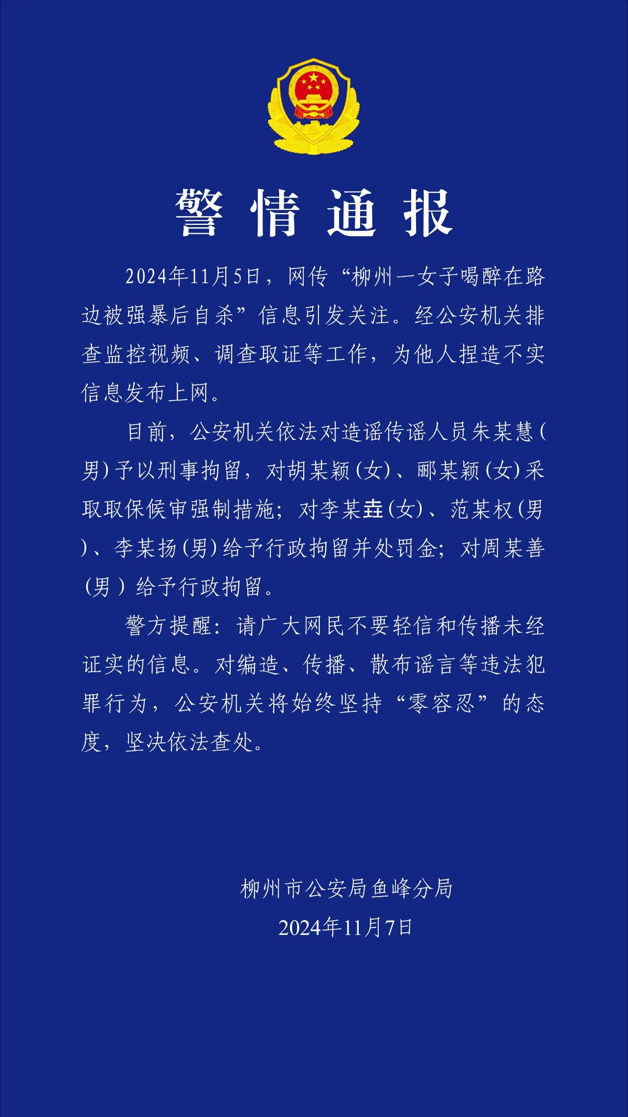 11月7日,柳州市公安局魚峰分局發(fā)布警情通報:依法對造謠傳謠人員朱某慧(男)予以刑事拘留,對胡某穎(女)、酈某穎(女)采取取保候?qū)弿娭拼胧粚钅硤?女)、范某權(quán)(男)、李某揚(男)給予行政拘留并處罰金;對周某善(男)給予行政拘留。