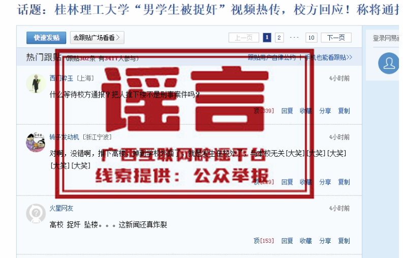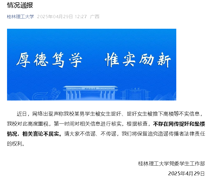 4月29日,桂林理工大學(xué)發(fā)布官方通報,根據(jù)核查,不存在網(wǎng)傳捉奸和墜樓情況,相關(guān)言論不屬實。桂林理工大學(xué)將保留追究造謠傳播者法律責(zé)任的權(quán)利。