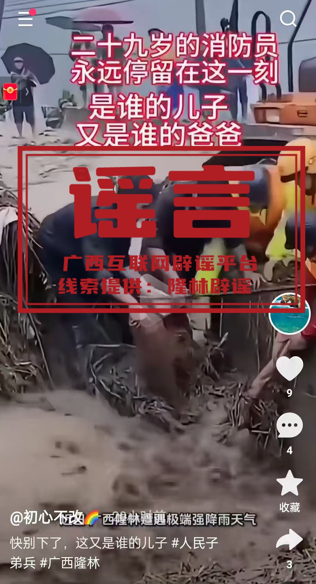 7月3日,有網(wǎng)民在短視頻平臺發(fā)布視頻稱“廣西隆林遭遇極端強降雨天氣,二十九歲的消防員永遠(yuǎn)停留在這一刻”,引發(fā)網(wǎng)民關(guān)注。 經(jīng)隆林各族自治縣消防救援大隊核實,此為不實信息,視頻內(nèi)容為其他地方救援畫面,而受困人員明顯不是消防員。在隆林各族自治縣的救援任務(wù)中,救援工作有序開展,并無消防員犧牲。