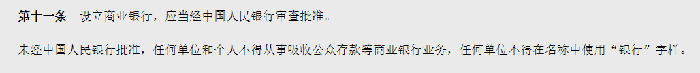 實(shí)際上,根據(jù)我國《商業(yè)銀行法》第十一條規(guī)定,設(shè)立商業(yè)銀行,應(yīng)當(dāng)經(jīng)國務(wù)院銀行業(yè)監(jiān)督管理機(jī)構(gòu)審查批準(zhǔn)。未經(jīng)國務(wù)院銀行業(yè)監(jiān)督管理機(jī)構(gòu)批準(zhǔn),任何單位和個(gè)人不得從事吸收公眾存款等商業(yè)銀行業(yè)務(wù),任何單位不得在名稱中使用“銀行”字樣。