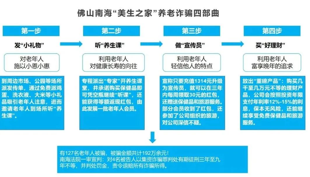 開辦“養(yǎng)生公司”,以發(fā)小禮物、開養(yǎng)生課、返現(xiàn)金紅包等手段騙取老年人信任,進而虛構(gòu)高回報理財產(chǎn)品騙取百余名老年人錢財192萬元。5月30日,廣東省佛山市南海區(qū)人民法院公開宣判一起集資詐騙案,主犯甘某獲刑九年,并處罰金50萬元,其余3名被告人分別被判處有期徒刑,并處罰金。同時,法院判令4名被告人退賠所有詐騙所得。