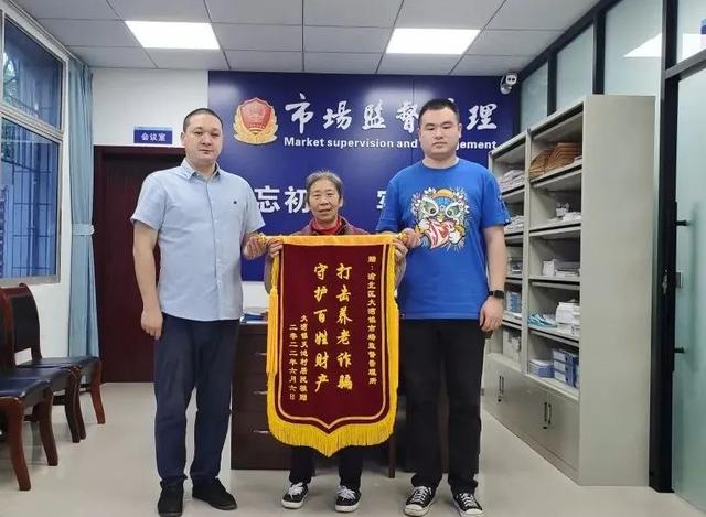 ▲6月6日,黃大媽等村民為大灣鎮(zhèn)市場監(jiān)管所送去錦旗,上書“打擊養(yǎng)老詐騙 守護(hù)百姓財產(chǎn)”。