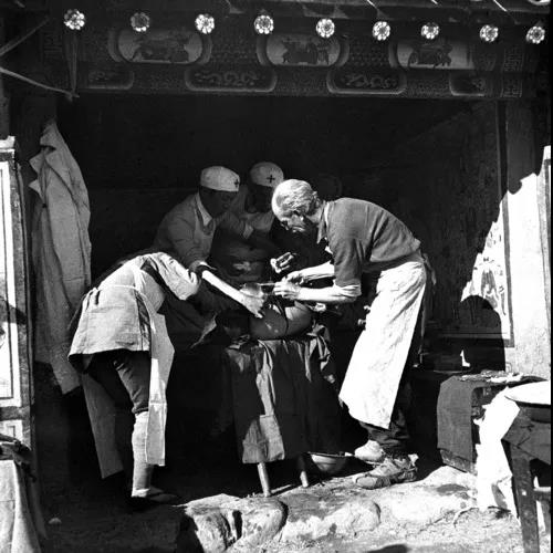白求恩在晉察冀邊區(qū)淶源縣臨時(shí)手術(shù)室里為傷員做手術(shù)(資料照片)