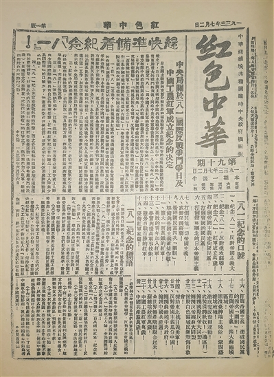 1933年7月2日,《紅色中華》刊載《中央局關(guān)于“八一”國(guó)際反戰(zhàn)爭(zhēng)斗爭(zhēng)日及中國(guó)工農(nóng)紅軍成立紀(jì)念的決定》。