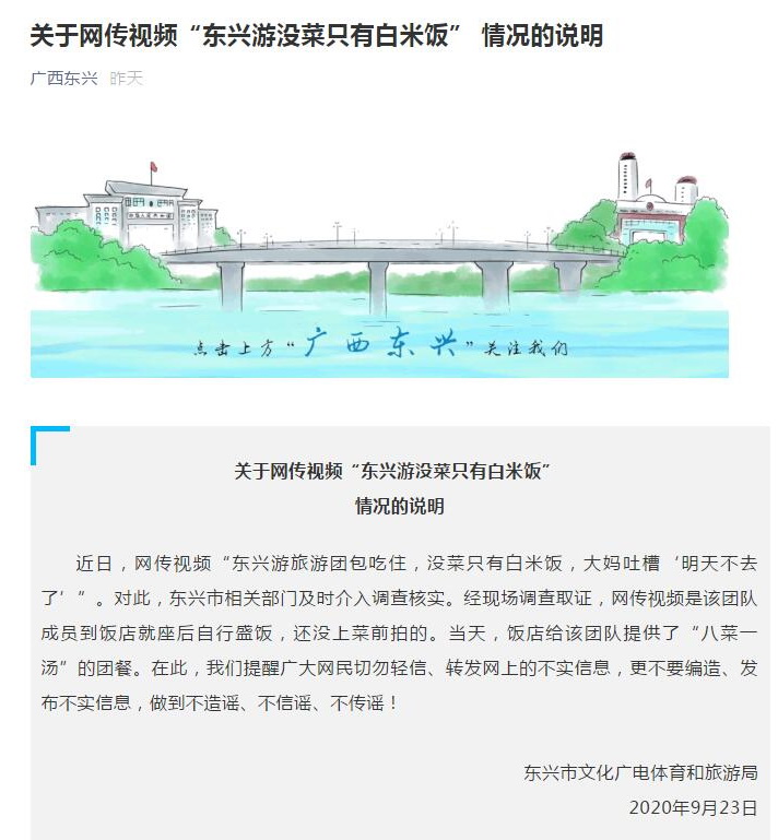 據(jù)廣西東興市委員會宣傳部微信公眾號23日消息,廣西東興市文化廣電體育和旅游局通報關(guān)于網(wǎng)傳視頻“東興游沒菜只有白米飯” 情況的說明。