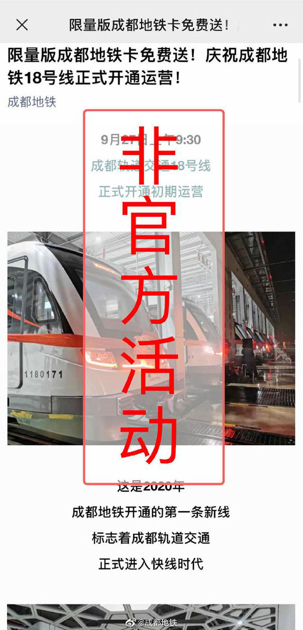 據(jù)成都地鐵官方微博消息,近期,有自媒體賬號以“成都地鐵”名義發(fā)布免費領(lǐng)取成都地鐵卡相關(guān)活動,引發(fā)不少成都市民在朋友圈轉(zhuǎn)發(fā)文章《限量版成都地鐵卡免費送!慶祝成都地鐵18號線正式開通運營!》。經(jīng)成都軌道交通集團(tuán)有限公司核實,成都地鐵官方并未舉辦此項活動,此網(wǎng)頁二維碼誘導(dǎo)跳轉(zhuǎn)鏈接頭像為“你好成都”的賬號并非成都地鐵官方賬號,請廣大市民乘客謹(jǐn)慎參與。成都地鐵嚴(yán)厲譴責(zé)此類冒充“成都地鐵”官方賬號名義誘導(dǎo)關(guān)注及抽獎的行為,如因相關(guān)行為給成都地鐵和廣大市民乘客造成惡劣影響及利益損失的,成都軌道交通集團(tuán)有限公司將依法嚴(yán)肅追究其相關(guān)法律責(zé)任。